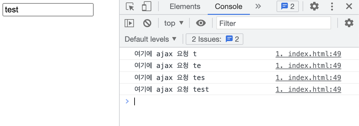 문제는 한 글자 칠 때마다 ajax 요청이 실행된다는 것이다. 't', 'te', 'tes', 'test' 모두 요청이 실행된다. 4번이나 요청을 했다(한글같은 조합형 언어는 더 많은 이벤트가 발생할 것이다).